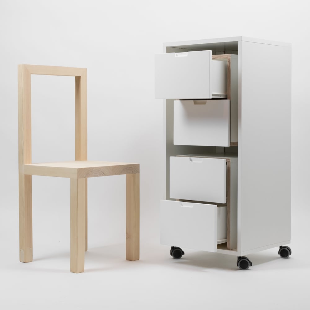 Materials: Melamine chest of drawers and birch plywood. Solid pine chair.